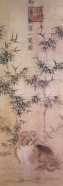 明宣宗朱瞻基一生喜爱射猎,在美国沙可乐博物馆收藏有一件据信是他亲笔绘制的《双犬图》。画中两只猎犬并肩而立,神采各异。这件皇帝专门为猎犬而作的绘画,不仅体现出其对猎犬的喜爱,也接续起了李迪建立的绘画传统。不同的是,画面中还出现了萱花等植物形象,进一步丰富了画面的内容与意蕴。