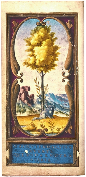 维吉尔诗歌集中的插画,一只小狗立于月桂树下,在构图上与中国画《一笑图》有异曲同工之妙