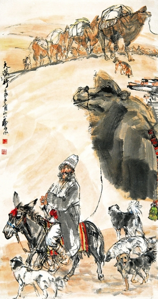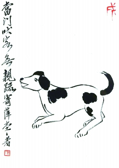 不拘一格的齐白石则在继承这一传统构图模式之余,开创性地用简笔线条的造型方法使狗的形象跃然纸上,画面上辅以题词,既增加了趣味,也丰富了画意。他还自称“青藤门下走狗”,以表达甘拜先贤为师的自谦之情。黄胄素有画狗“天下第一”的美誉。他一生爱狗知狗,用速写、素描、水墨等多种艺术形式描绘了大量不同形象与品质的狗。在画中,它们有的为边民放牧,有的伴驼队探险,有的与主人嬉戏,有的陪战士戍边,可谓集历代画狗之大成,把狗与人类的相亲相守刻画得淋漓尽致、动人心扉。