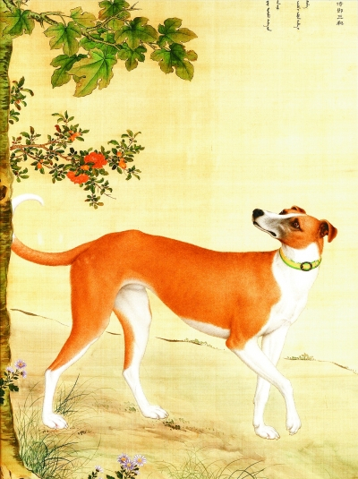 描绘异域进贡名犬的传统,直到清代乾隆时期才再度振兴。我们今天还能看到乾隆帝分别命宫廷画师和西洋画家以中西不同画法所绘制的《十犬图》和《十骏犬图》。在《十犬图》册页中,我们看到画里的猎犬逐鹿、追兔甚至搏虎,尽显威猛;而分藏在两岸故宫的两套各自出于郎世宁和艾启蒙之手的《十骏犬图》,尽管作者及画面不同,但作为主角的十只贡犬却是一样的。相较于前者,乾隆帝为《十骏犬图》里的每一只猎犬都以满、汉、蒙三种语言精心起名,表达出对它们深深的宠爱与希冀。他甚至还定制了瓷制猎犬用于把玩。而“十犬”谐音“十全”,自然更是让这位以“十全武功”自诩的皇帝沾沾自喜。