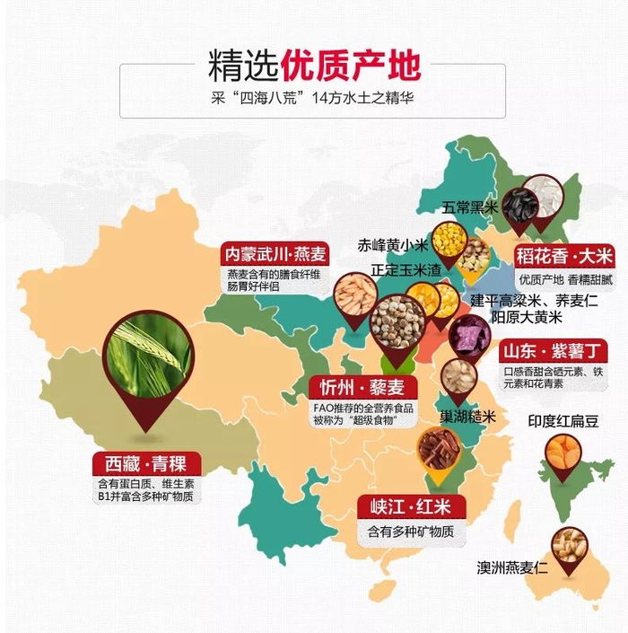 谷物香米杂粮原料都经过预处理,高温烘制,低温烘干,无需浸泡,冲洗即可蒸煮。