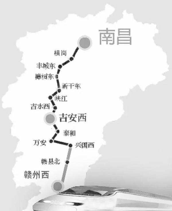 昌吉赣客专计划2019年12月竣工。自南昌枢纽引出,沿京九通道向南延伸,经宜春市所辖的丰城、樟树,吉安市及其所辖的新干、峡江、吉水、吉安、泰和、万安,由兴国经赣县区至赣州市赣州西站。