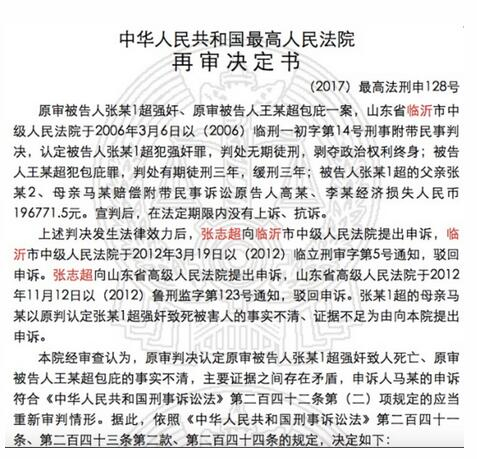 与此同时,警方并未获得张志超强奸杀人的直接客观证据,包括精液、毛发等。正是基于案件一审中未解的种种疑点,最高法在再审决定书中称,案件“事实不清、主要证据之间存在矛盾”。