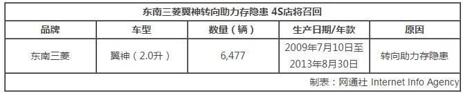 此次,东南(福建)汽车工业有限公司召回2009年7月10日至2013年8月30日期间生产的2010-2012年款部分东南三菱翼神2.0升乘用车,共计6,477辆。