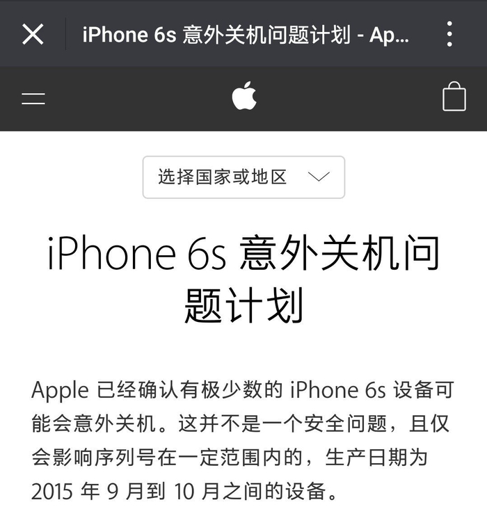 2016年,苹果曾表示,确认有“极少数”的 iPhone 6s 设备可能会意外关机,生产日期为 2015 年 9 月到 10 月之间的设备。