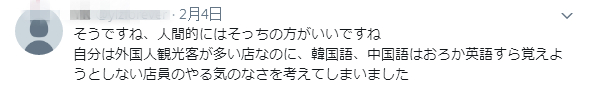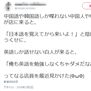 海外网2月5日电 最近,一位日本网友的推文引发了众多网友的关注和讨论。他在推文中称:最近发现了这样的店员,每当只会说中国话的中国人和只会说韩国话的韩国人进店,他们会在背后说坏话“学好日语再给我进来!”而每当只会说英语的白人进店,他们一脸无奈,“不好好学英语真不行呀!”