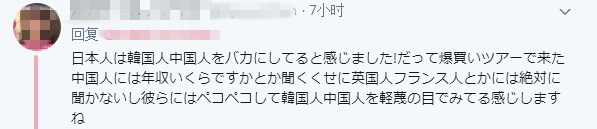 感觉日本人把中国人和韩国人当傻子了!看到中国人就问他们年收入多少之类的,但是碰到英国人和法国人等绝对不会问,还会对他们点头哈腰,日本人用轻蔑的眼神看中国人和韩国人。