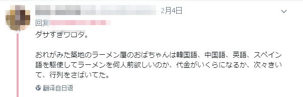 太土了(笑),我见过东京筑地某拉面馆的大妈能运用韩语、汉语、英语和西班牙语四国语言,一个一个地询问需要几人份、多少钱,待客娴熟。