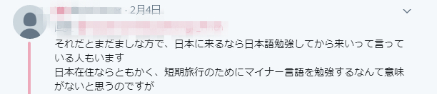这还算好,也有人认为,如果来日本,学好日语后再来。先不论是否侨居日本,单纯为了短期旅游而学习小众语言没有意义。