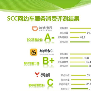 2月6日,上海市消保委通报2018网约车评测结果,并给三家网约平台开具“体检单”。其中,滴滴出行得分最高,评为A-,神州专车B+,易到为C。