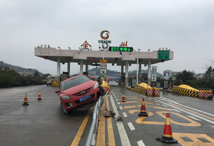 [开车捡手机]2018年1月28日中午,在广西桂林市全州县的全州收费站前,发生了一起因低头捡手机导致车辆撞上隔离护栏的交通事故。值得庆幸的是,司机系了安全带所以人并未受伤,但车辆受损严重。