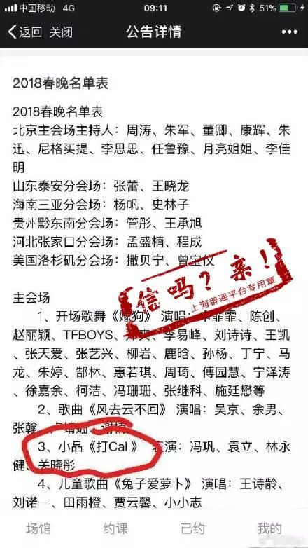 比如,2017年春晚节目单一直到腊月二十九晚上10时(2017年1月26日)才公布,而且最后还会标注“节目如有变化,以除夕当天直播为准”。因此,2018年央视春晚的真实节目单还是耐心等待官方公布吧。