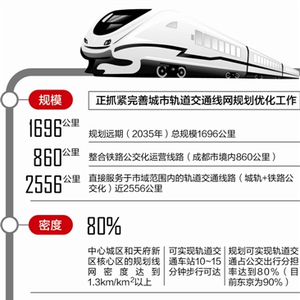 记者了解到,成都市正抓紧完善城市轨道交通线网规划优化工作。其中,规划远期(2035年)总规模1696公里;整合铁路公交化运营线路(成都市境内860公里),直接服务于市域范围内的轨道交通线路(城轨+铁路公交化)达到近2556公里。中心城区和天府新区核心区的规划线网密度达到1.3km/km2以上,与东京目前线网密度相当,可实现轨道交通车站10~15分钟步行可达。规划可实现轨道交通占公交出行分担率达到80%,而目前东京为90%。线网密度和轨道交通分担率均达到世界先进水平,规划实现后可进一步优化居民交通出行结构,提升居民出行品质。