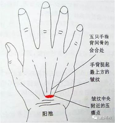 手掌向下,翘起手背,在手腕背面会出现几道皱褶,即腕背横纹。可以摸到从腕部向上连接食指、中指和无名指的三条肌腱(即指伸肌腱),以及和小指相连的一条肌腱(即小指固有肌腱)。在小指固有肌腱和无名指外侧的指伸肌腱之间,腕背横纹上,有一个明显的凹陷,就是阳池穴。常按摩此穴可以促进阳气的生发,暖身又养阳。