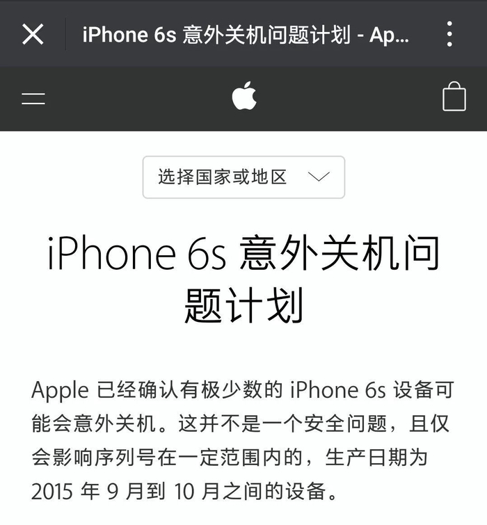 2016年,苹果曾表示,确认有“极少数”的 iPhone6s 设备可能会意外关机,生产日期为 2015年9月到10月之间的设备。