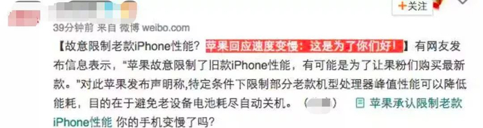 2017年,苹果发布声明称,特定条件下限制部分老款机型处理器峰值性能可以降低能耗,目的在于避免老设备电池耗尽自动关机。