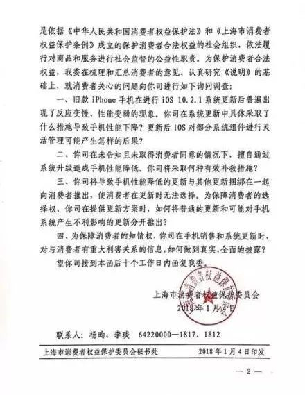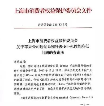 据上海市消费者权益保护委员会网站显示,为了维护苹果用户的合法权益,上海市消保委发出查询函。