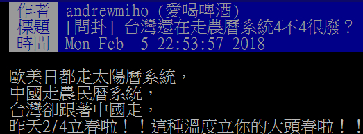 5日晚,有“台独”分子在台湾一论坛发文,对台湾和大陆一样使用农历表达不满。(图片来源:台媒)