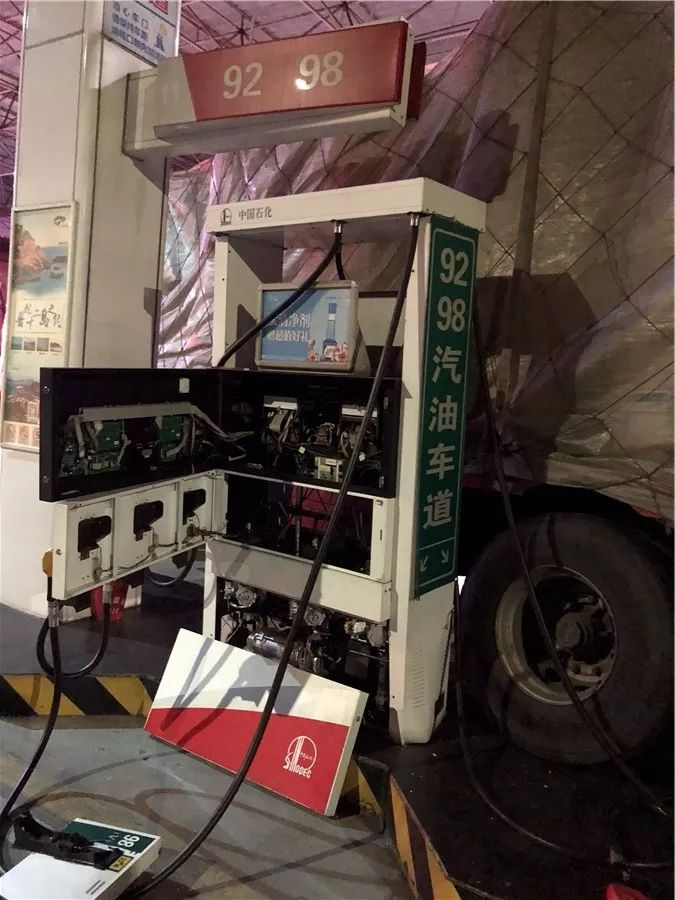 被撞的是靠最外侧92、98号汽油的加油机,整个加油机已经被撞得倾斜,并弥漫着浓重的汽油味。