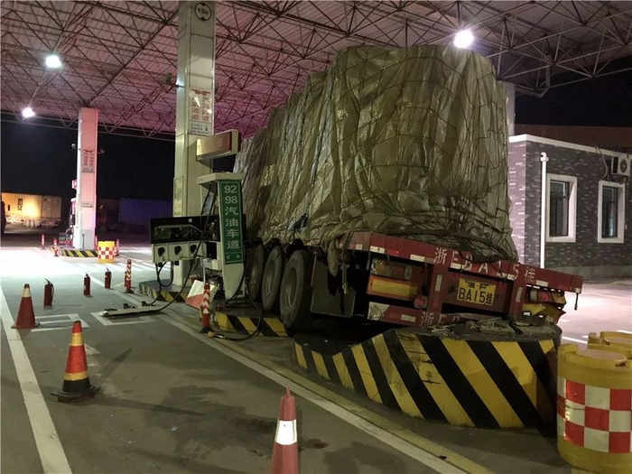 2月6日凌晨3点,高速交警接到报警,称沈海高速台州方向奉化服务区内一辆重型半挂车撞到加油站的加油机。交警立即赶到现场处置。
