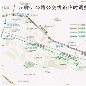 注:晚18:00交通管制后,50路不再经过商业学校、荔昌陶瓷市场、十二街区、十一街区、兰炼医院、公园路口、 山丹街路口、石化学院西区、水厂家属院、寺儿沟桥、寺儿沟等11处原线路停靠站点。