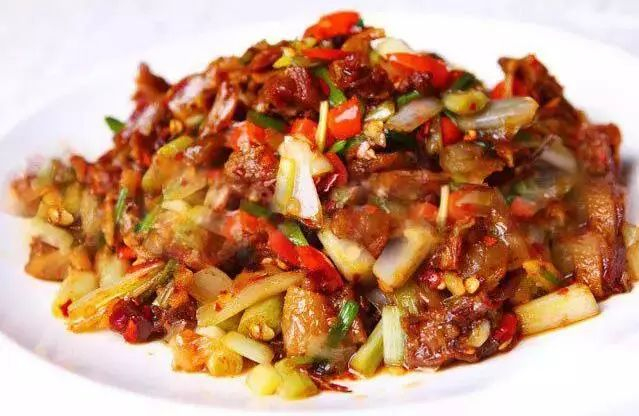 即放入切好的板鸭块爆炒4-5分钟,放少许料酒,再放入西芹、青椒、拌炒2分钟即可上碟。