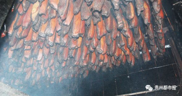 (正在烘烤房里烘烤的腊肉。)