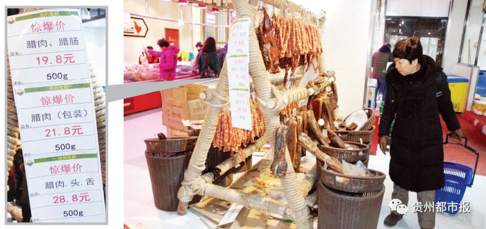 2月4日下午,贵州都市报记者来到该超市进行了探访,记者看到,超市进门左后方的食肉摊区,确实摆放着大量腊肉、香肠,散装腊肉、香肠标价每斤19.8元,用真空袋包装好的每斤标价21.8元。这个价格和其他市场相比,低了6-8元。