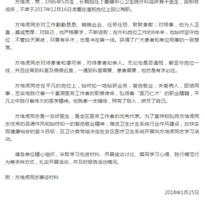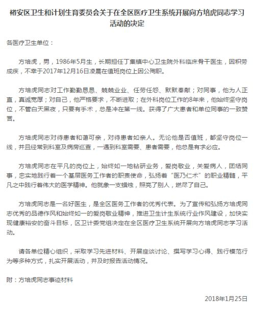 然而,1月25日,裕安区卫计委一则《关于在全区医疗卫生系统开展向方培虎同志学习活动的决定》