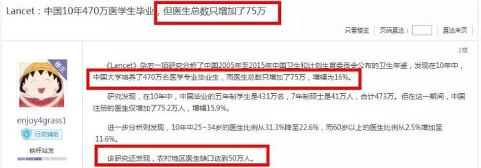 Lancet杂志说:中国10年间有470万医学生毕业,医生总数只增加了75万。