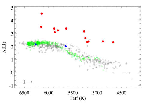 年老的小质量贫金属星在其大气中保留了大爆炸核合成产生的原初物质,它们在演化初期(变成红巨星之前)几乎拥有相同的常数锂丰度。随着恒星演化到达红巨星支,挖掘过程会将核心物质与表面大气混合,从而稀释其表面的锂含量,使恒星的锂丰度降低一个量级以上。研究者通过对球状星团的系统观测验证了上述过程,同时也表明了小质量恒星结构与演化模型的成功。但随着银河系恒星观测数据的大量积累,十余颗锂含量超高的小质量红巨星相继被发现,目前尚无完善的模型能够解释这一现象,也无系统观测研究。