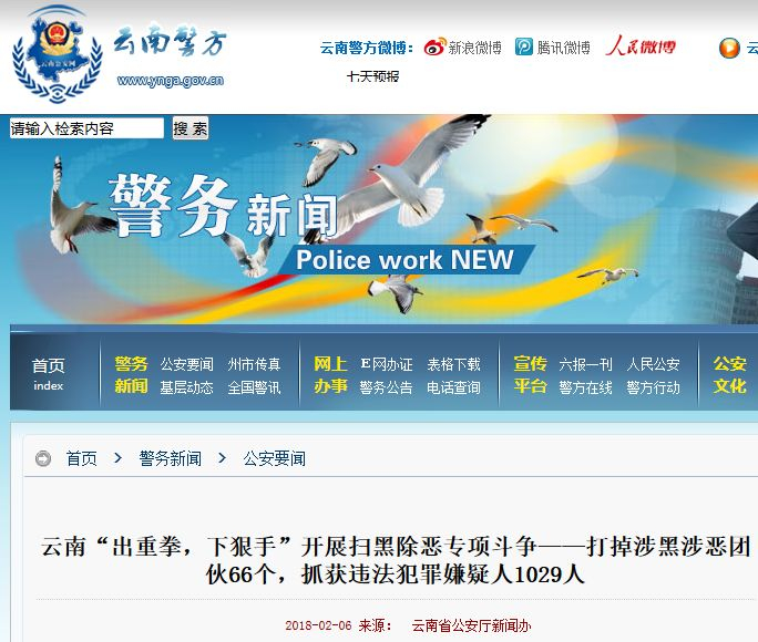 2月6日,云南网记者从云南省公安厅获悉,云南“出重拳,下狠手”开展扫黑除恶专项斗争,已打掉涉黑涉恶团伙66个,抓获违法犯罪嫌疑人1029人。