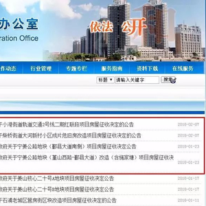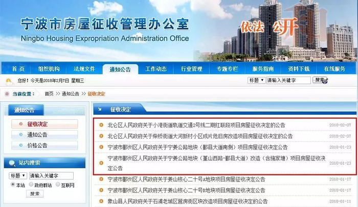 近日,宁波市鄞州区人民政府发布了关于宁姜公路地块(堇山西路-鄞县大道)改造(含施家塘)项目房屋征收决定、宁姜公路地块(鄞县大道南侧)项目房屋征收决定的公告;北仑区人民政府发布了关于柴桥街道大河新村小区成片危旧房改造项目房屋征收决定、小港街道轨道交通2号线二期红联段项目房屋征收决定的公告。