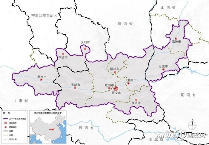 正式对外公布的关中平原城市群规划范围包括陕西省西安、宝鸡、咸阳、铜川、渭南5个市、杨凌农业高新技术产业示范区及商洛市的商州区、洛南县、丹凤县、柞水县,以及山西运城、临汾,甘肃天水、平凉等地共687个建制镇。