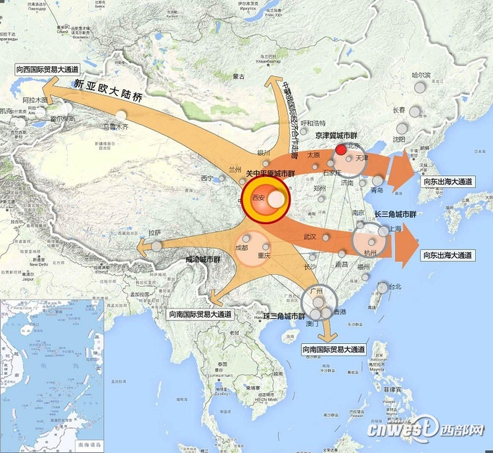 关中平原城市群开放格局示意图。支持西安设立外国领事机构 打造丝路经济带规模最大的国际物流枢纽