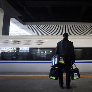 高铁进站停车前5分钟,配送员已经站在指定站台的指定位置等待,通常是餐车的位置。