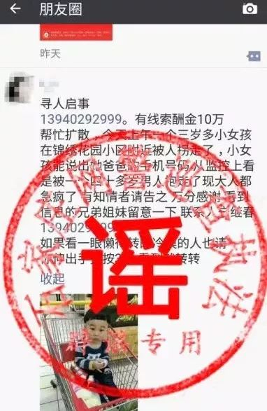 至此,警方可以断定,朋友圈传播“锦绣花园有人拐孩子”的信息为谣言。此类信息经常流传于网络,有时只是换个城市名称,其他内容一模一样。发这些假消息的罪魁祸首,大多是为了“吸粉”。不少普通市民看到后,出于同情心和善意,都会进行转发,导致谣言迅速扩散。
