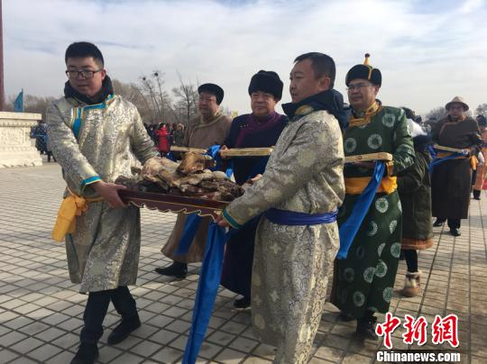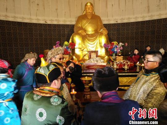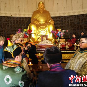 中新网呼和浩特2月8日电(记者张玮)8日是中国传统小年,蒙古族传统祭祀在内蒙古自治区首府呼和浩特市举行,活动包括蒙古族传统成吉思汗祭祀和祭灶仪式,由第37代成吉思汗守陵人古日扎布主持。