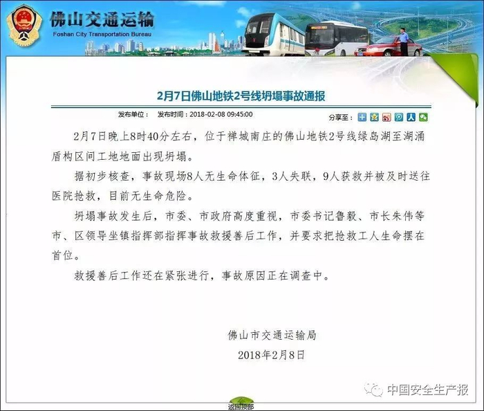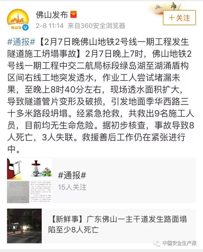 今天中午,@佛山发布 公布初步调查原因,并发布事故处置进展情况: