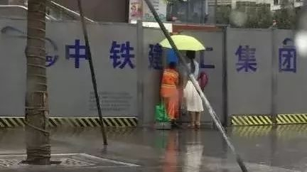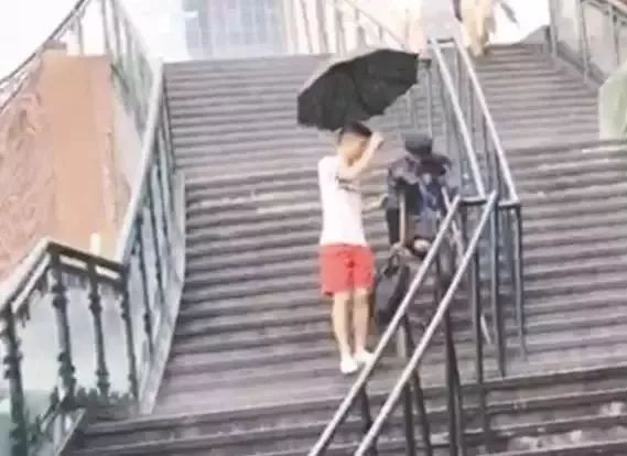 同样的那场大雨中,一位成都妹子在暴雨中为环保工人撑伞。也有小哥哥拿着黑伞搀扶一名残疾人士下楼梯,自己却暴露在雨中。
