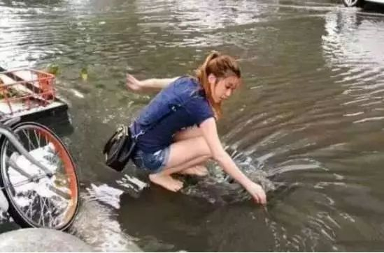 去年7月,一场暴雨后。为了让街上的积水顺利流走,一位妹子光着脚徒手清理井盖上的枯叶。