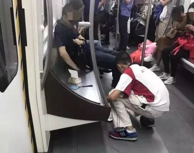 成都地铁3号线上,一位儿子去接刚下班的父亲,可能是因为父亲晚上有应酬喝多了,在地铁上就吐了。但这位小弟弟先擦拭父亲身上的东西,再蹲下来擦地,最后才是自己。旁人递上一包纸,他笑着说谢谢。