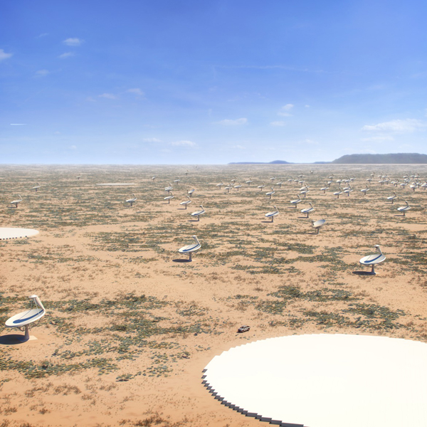 非洲的中频SKA一期工程将建设大约200面天线,巡天时能捕捉350兆赫至14千兆赫的射电信号。图为南非卡鲁高原上的中频孔径阵列想象图。