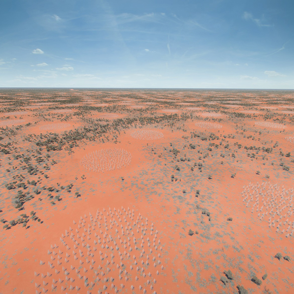 低频孔径阵列散布在澳大利亚默奇森地区的艺术想象图。