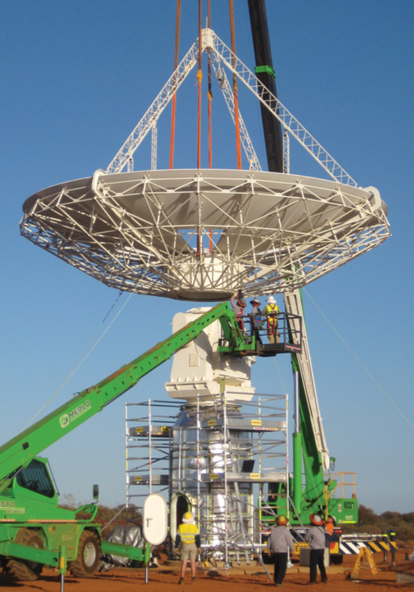 非洲的先导项目为64面“猫鼬”(MeerKAT)天线,预计几年后部署完成。图为第一面“猫鼬”天线于2014年3月安装完成。它们在第一阶段作为独立的装置产生科学成果,未来则会与其他130面天线一起组成中频SKA设施。