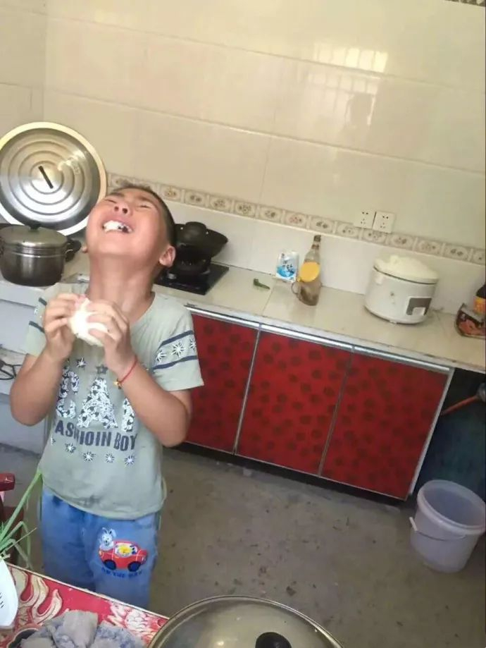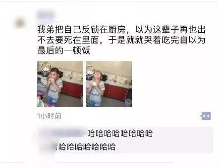 弟弟把自己反锁在厨房里了,以为这辈子再也出不去,就哭着吃完了自以为最后的一顿饭,边哭边吃……没有什么能阻挡吃货对食物的向往,包括生死