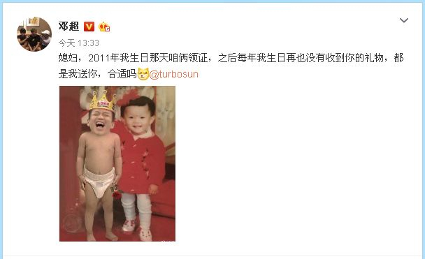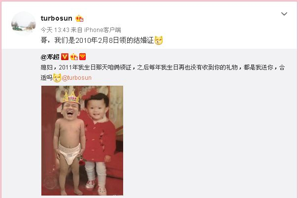 【邓超记错结婚纪念日】今天中午,邓超在微博晒出自己与童年孙俪的搞怪合照,配文称:“媳妇,2011年我生日那天咱俩领证,之后每年我生日再也没有收到你的礼物,都是我送你,合适吗?”随后孙俪回复:“哥,我们是2010年2月8日领的结婚证。”emmmmmm,超哥快向娘娘请罪