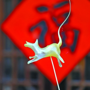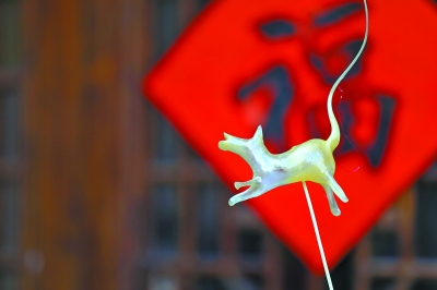 2018年2月6日,北京铁树斜街93号院博物馆非遗迎新庙会,一个生肖狗的糖人和福字构成了庙会里的和谐之音。光明图片/视觉中国