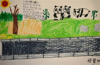 一条长长的石板路,草坪上坐着三只熊猫,“2月8日我来到熊猫绿道,我看到可爱的熊猫,绿油油的竹子……里面我最喜欢这些可爱的熊猫了,我还希望这里以后可以建一个游乐园。”八岁的郑紫妍在画上写上日记。孙学鹏看到“游乐园”这个愿望时,他笑着告诉郑紫妍:“以后会有的!”