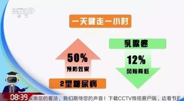 一天健走一小时,对2型糖尿病有50%的预防效果。可以使患乳腺癌的风险降低 12%。